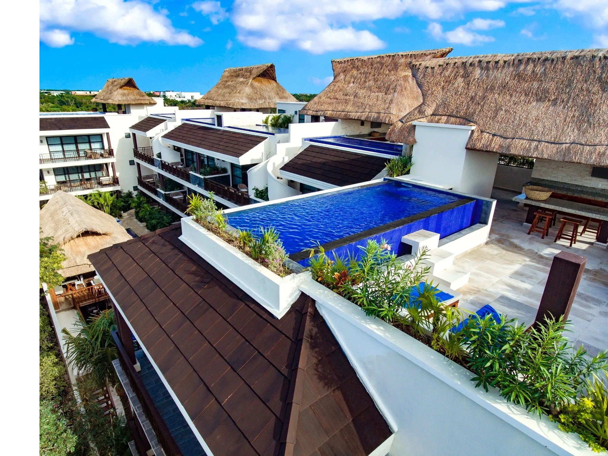 An elevated boho retreat with curated luxury, our 3 bedroom 4 bathroom penthouse residence will spoil you with high-end finishes, an extremely spacious floor plan with wrap-around terraces, a fully equipped open-concept kitchen and living area, plus a private rooftop with large infinity pool and shady palapa.